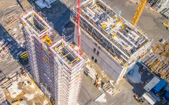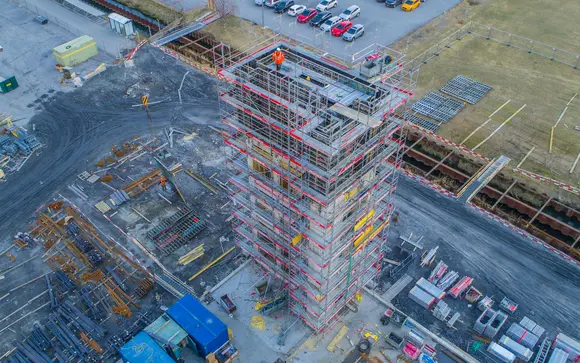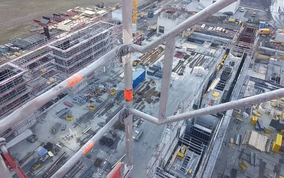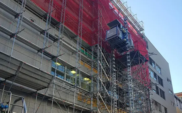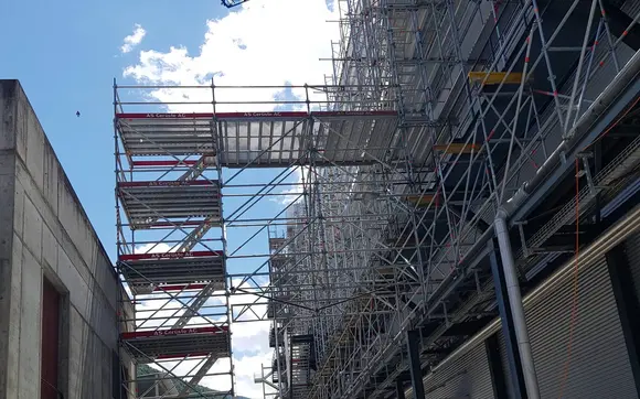 Aufbau Fassadengerüste, Treppentürme und Materialaufzüge für Neubau Industriegebäude IRKUKA.