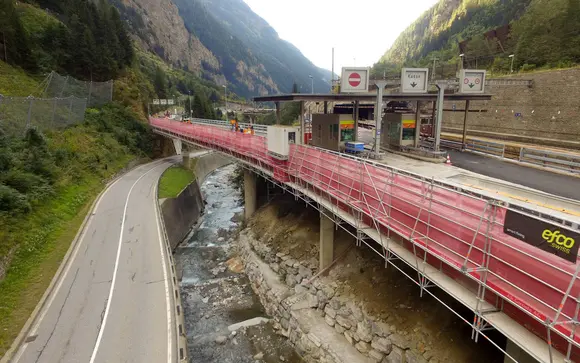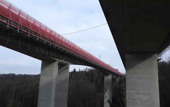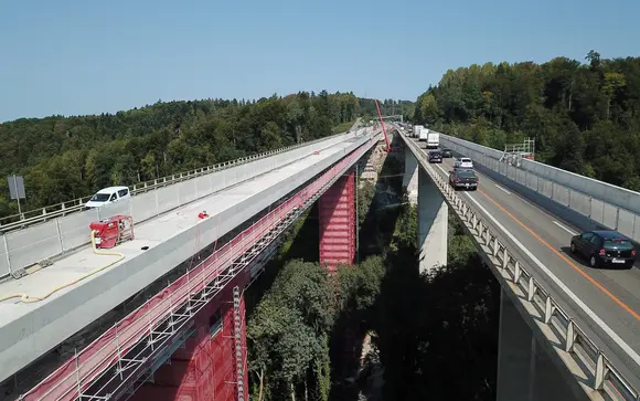 Aufbau Allroundgerüst für die Beton- und Brückenkopfsanierungen (2 Brücken à 450 Meter). Aufbau Flächengerüst für die Erneuerung der Rohrleitungen im Inneren der Brücken. Aufbau Personen- und Materialaufzug bis 1000kg. Aufbau zweier Allroundbrücken für die sichere Überquerung der Autobahnen.