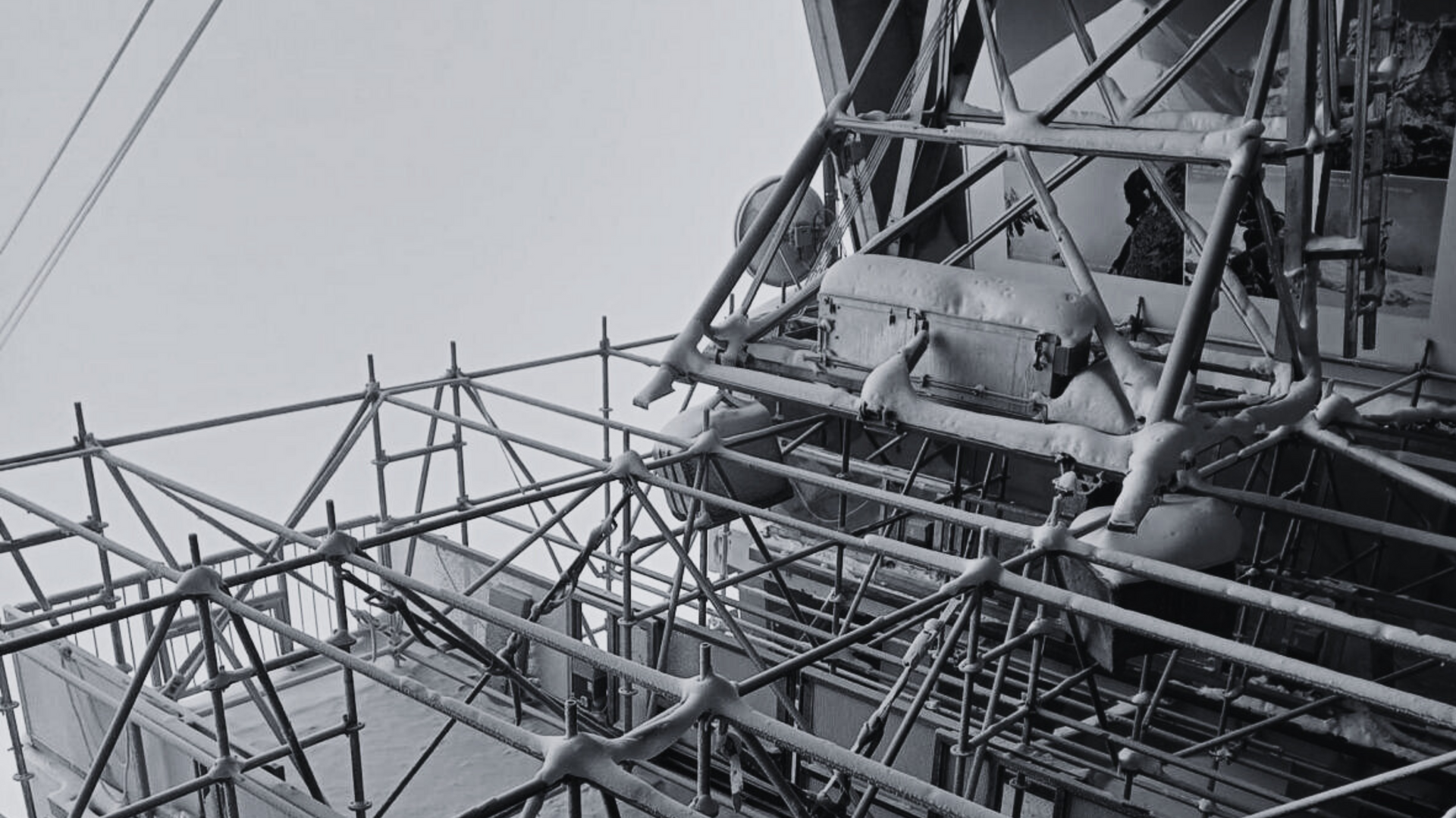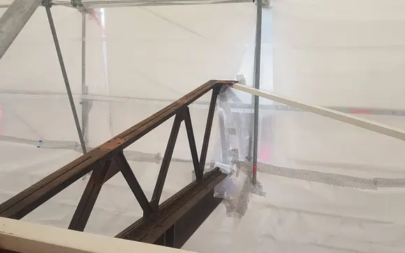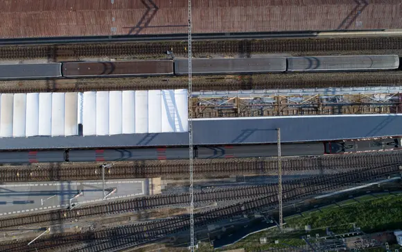 Flächengerüst für Sanierung Perrondächer 2 & 3. Einhausung der Perrondächer mit Schrumpffolie.