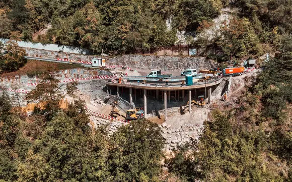 We carried out the following work: Construction of temporary carriageway bridge with TG60 shoring, blasting work, anchor drilling (permanent anchors and strand anchors), removal of material.